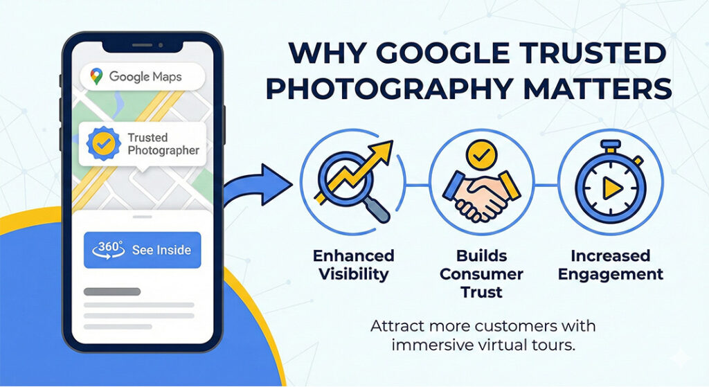 Google Trusted Photography helps your business stand out with high-quality 360° virtual tours and professional images that appear directly on Google Search and Google Maps. It builds trust, improves engagement, and encourages customers to visit your location.